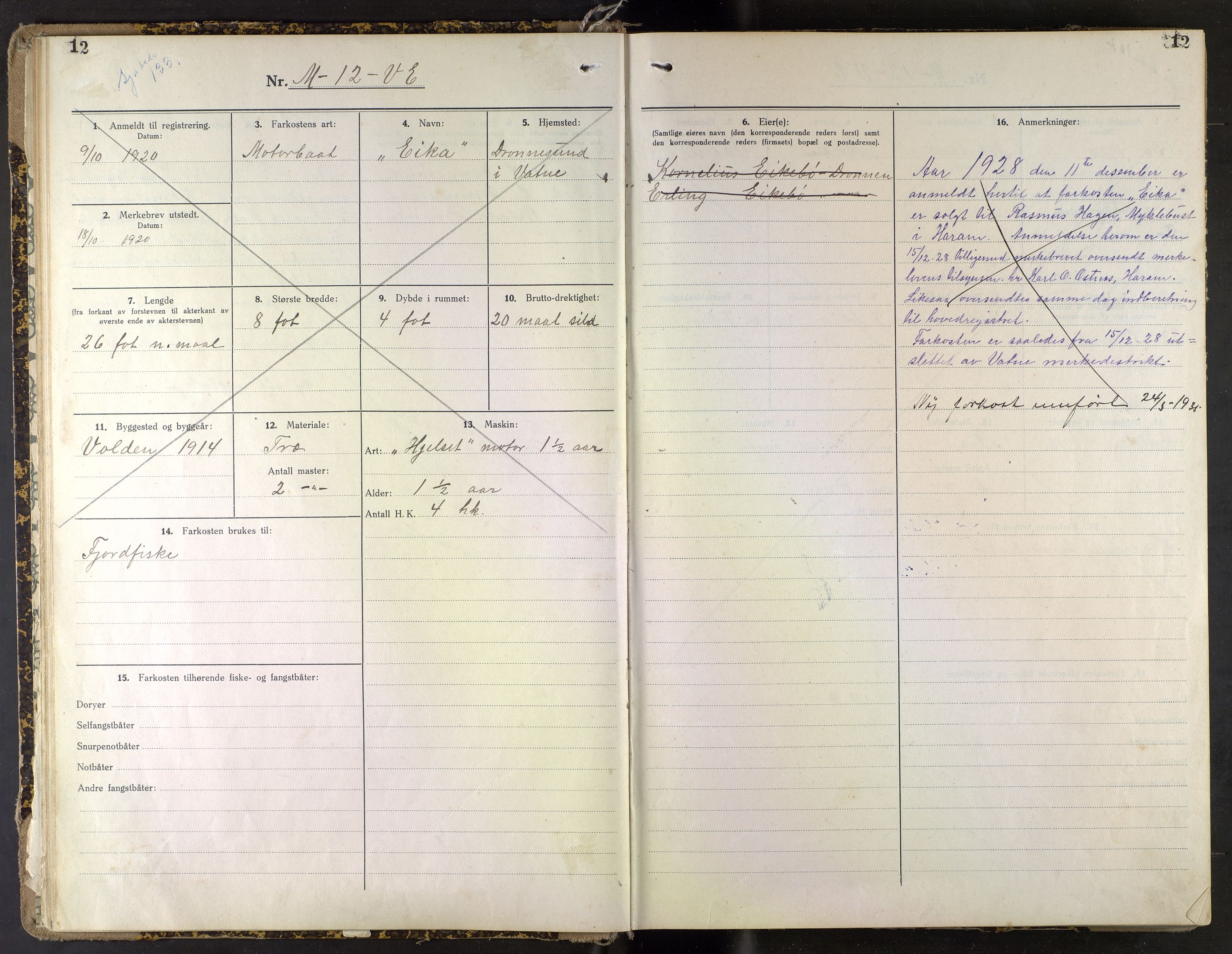 Fiskeridirektoratet (Båtkontoret), Merkeregisteret for fiskeriflåten - Møre og Romsdal, nr. 122: Merkeprotokoll for Vatne, 1920-1953, Astaref: AV/SAB-A-2003/I/Ia/Iaf/L0122