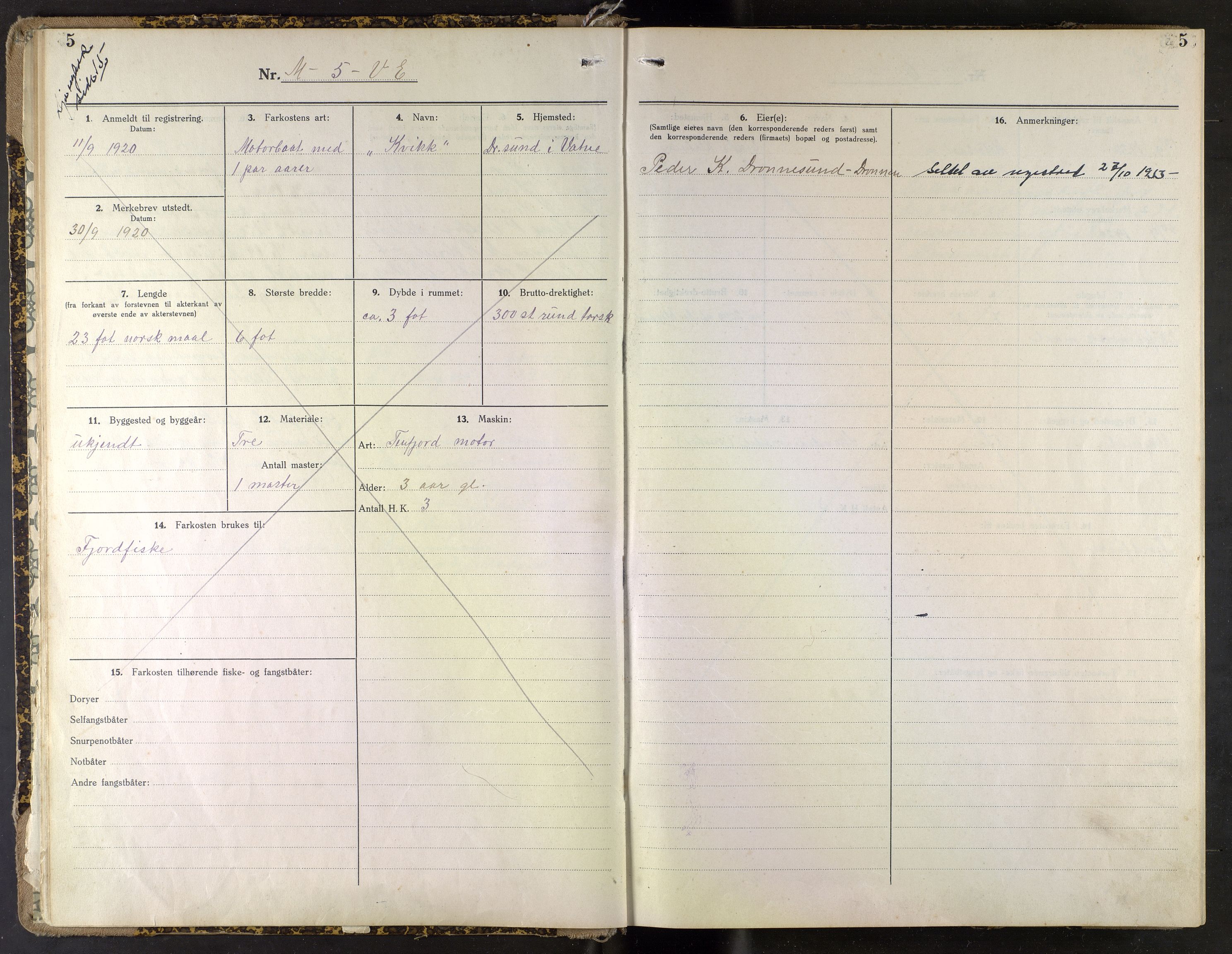 Fiskeridirektoratet (Båtkontoret), Merkeregisteret for fiskeriflåten - Møre og Romsdal, nr. 122: Merkeprotokoll for Vatne, 1920-1953, Astaref: AV/SAB-A-2003/I/Ia/Iaf/L0122