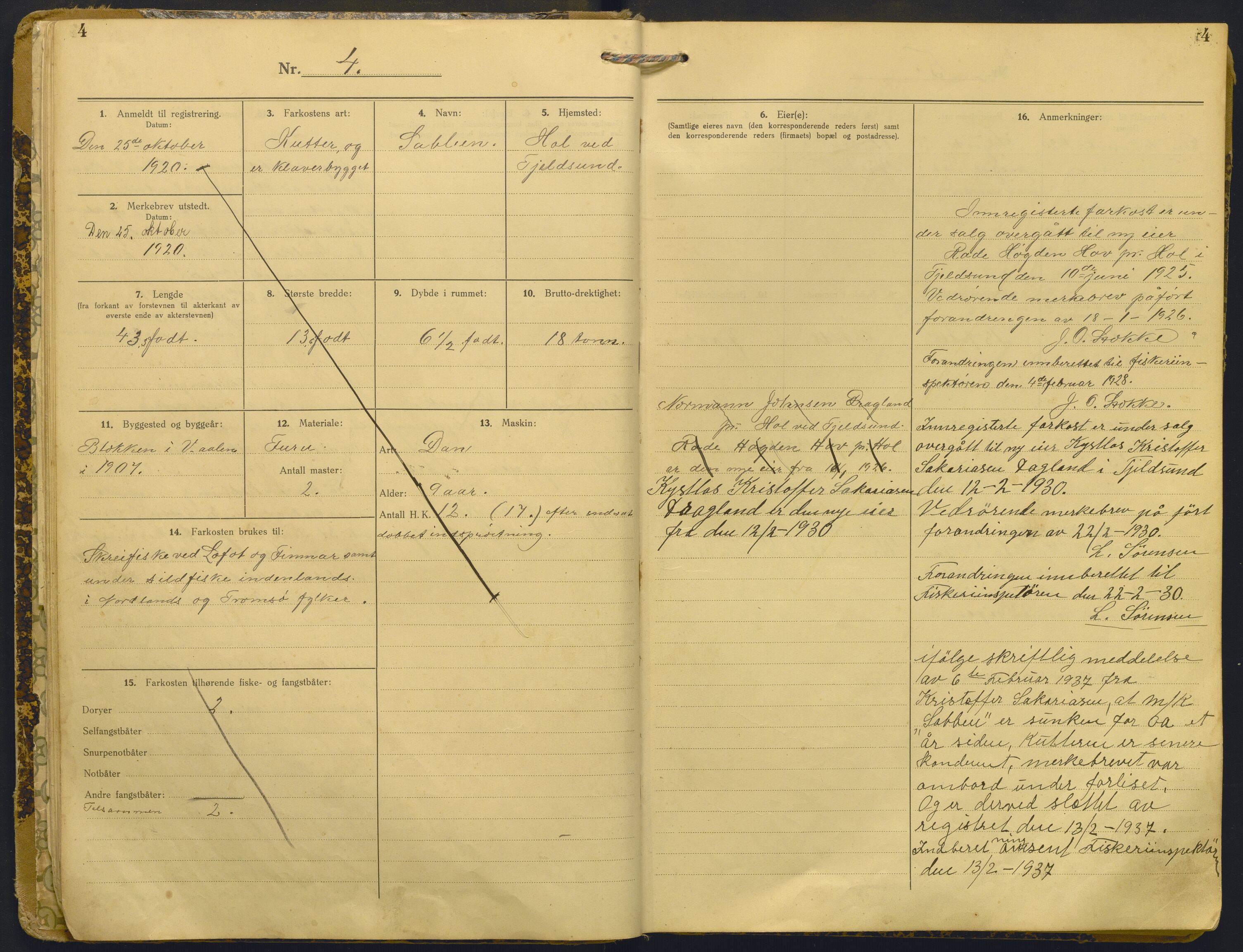 Fiskeridirektoratet (Båtkontoret), Merkeregisteret for fiskeriflåten - Nordland, nr. 171: Merkeprotokoll for Tjeldsund, 1920-1956, Astaref: AV/SAB-A-2003/I/Ia/Iac/L0171