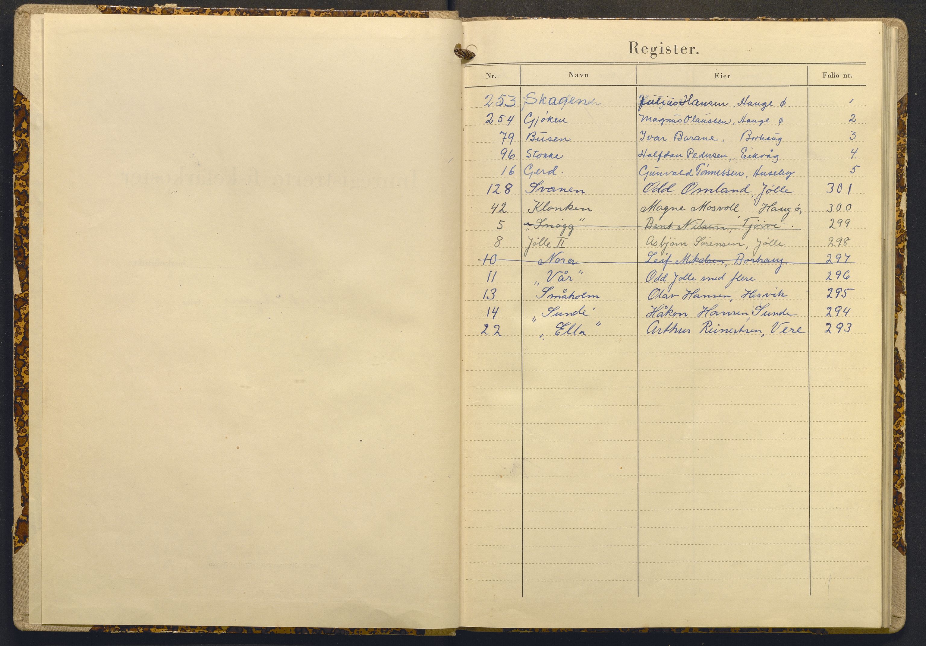SAB-A-2003: Fiskeridirektoratet - 1 Adm. ledelse - 13 Båtkontoret I: 135 Merkeregisteret for fiskeflåten Ia: Merkeprotokoller Iaj: 135.10 Merkeregisteret for fiskeriflåten - Vest-Agder L0023: 135.1010/4 Merkeprotokoll - Lista Other source