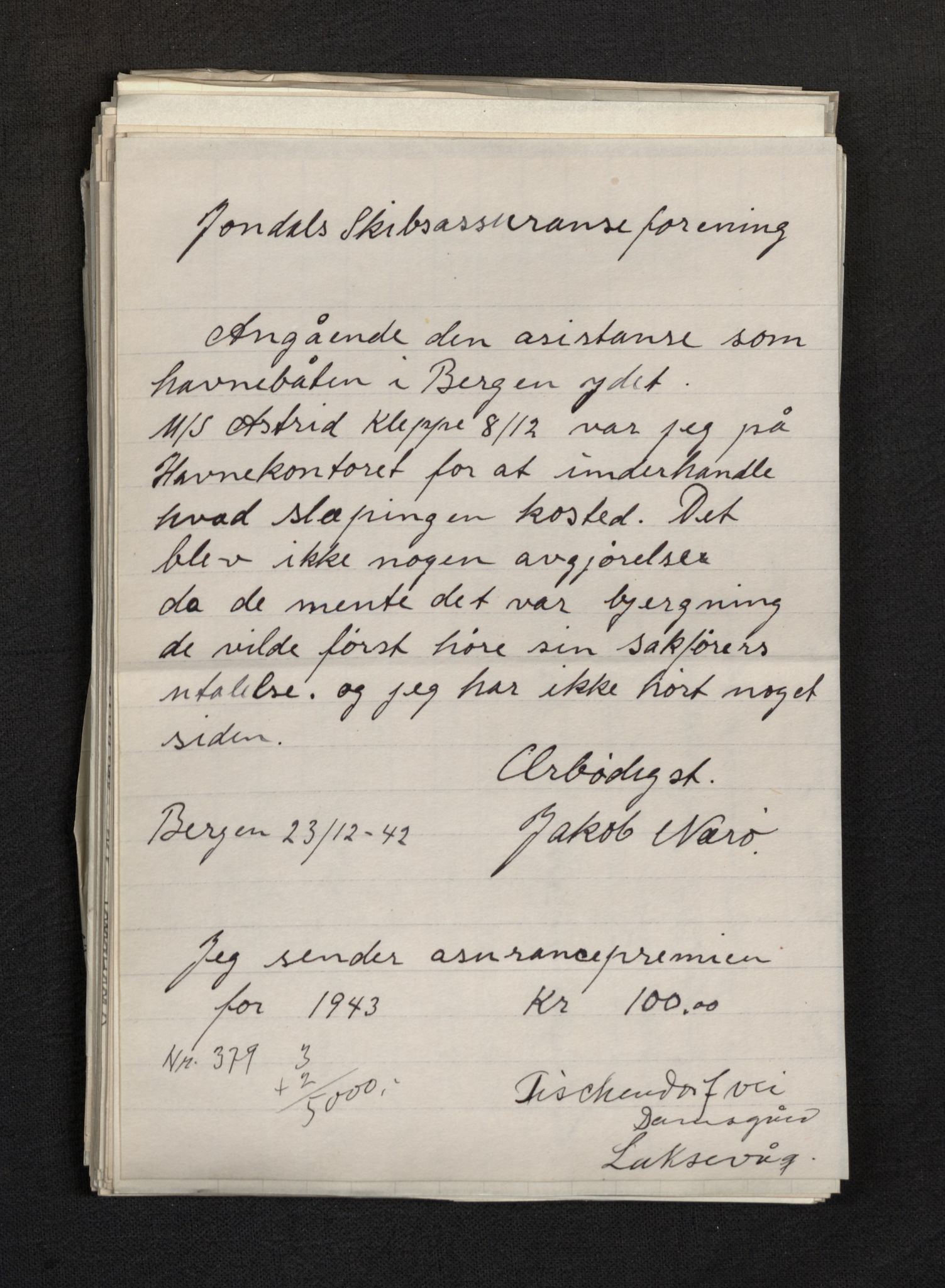 Jondal Skipsassuranseforening, Serie E, nr. 113: Korrespondanse, 1943, Astaref: AV/SAB-SAB/PA-0276/E/L0113