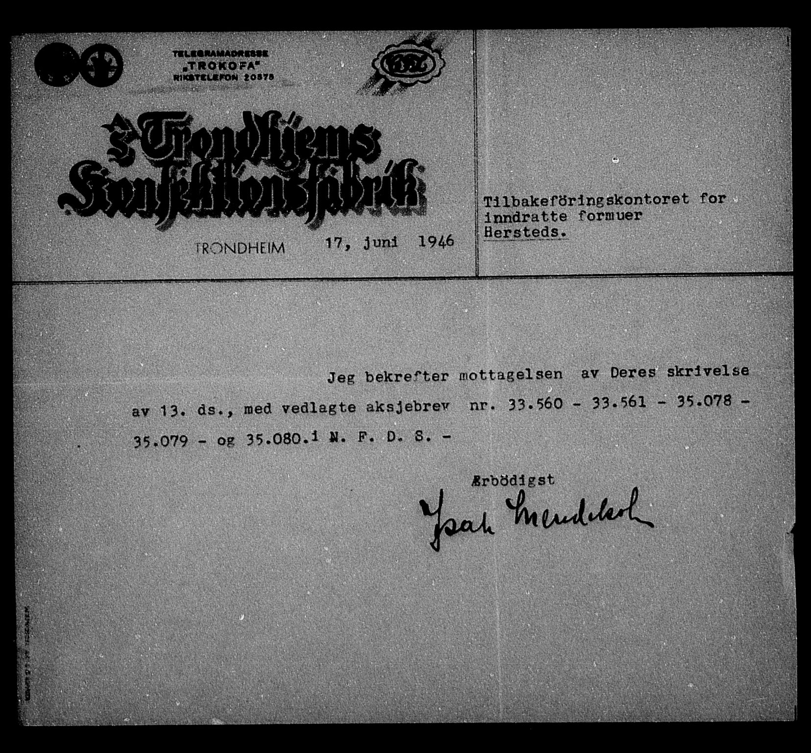 Jew estates no. 909 /1945 - 1947 - Trondhjems Konfektionsfabrik (Tro-Ko-Fa) - Wolfkoffs barn Second world war State archives Government departments Holocaust