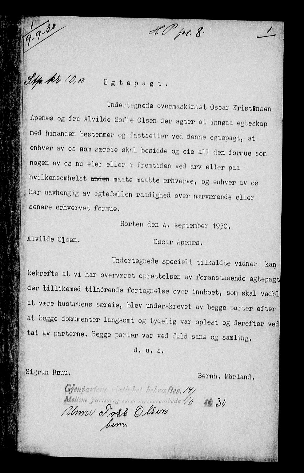Mortgage book for Mellom Jarlsberg sorenskriveri, Horten tinglag 1930-1933, Astaref: AV/SAKO-A-132/G/Ga/Gae/L0016