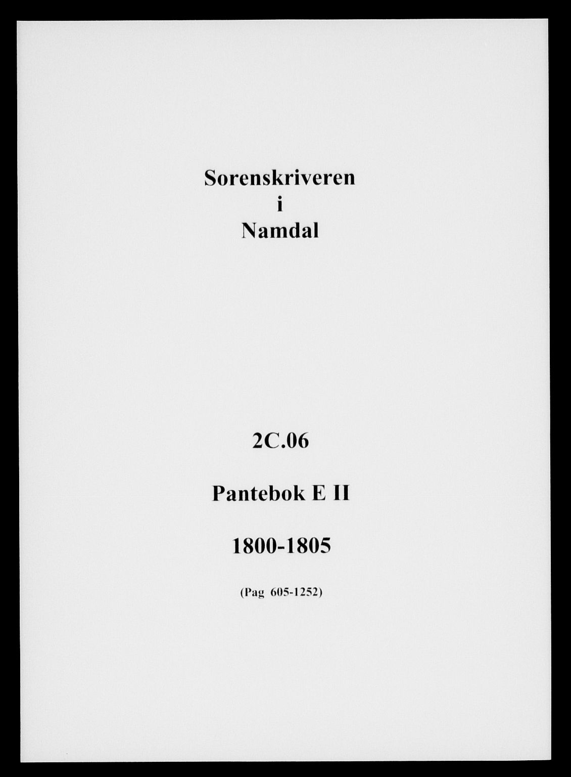 no. E2 /05.07.1800 - 06.05.1805Nord-Trøndelag county Namdal jud. dist. Pantebok E (1795-1805) er delt i to: 1 med pag. 1-604 og 2 med pag. 605-1252.Deed registrationPledge booksPropertyState archivesJudges and clerks