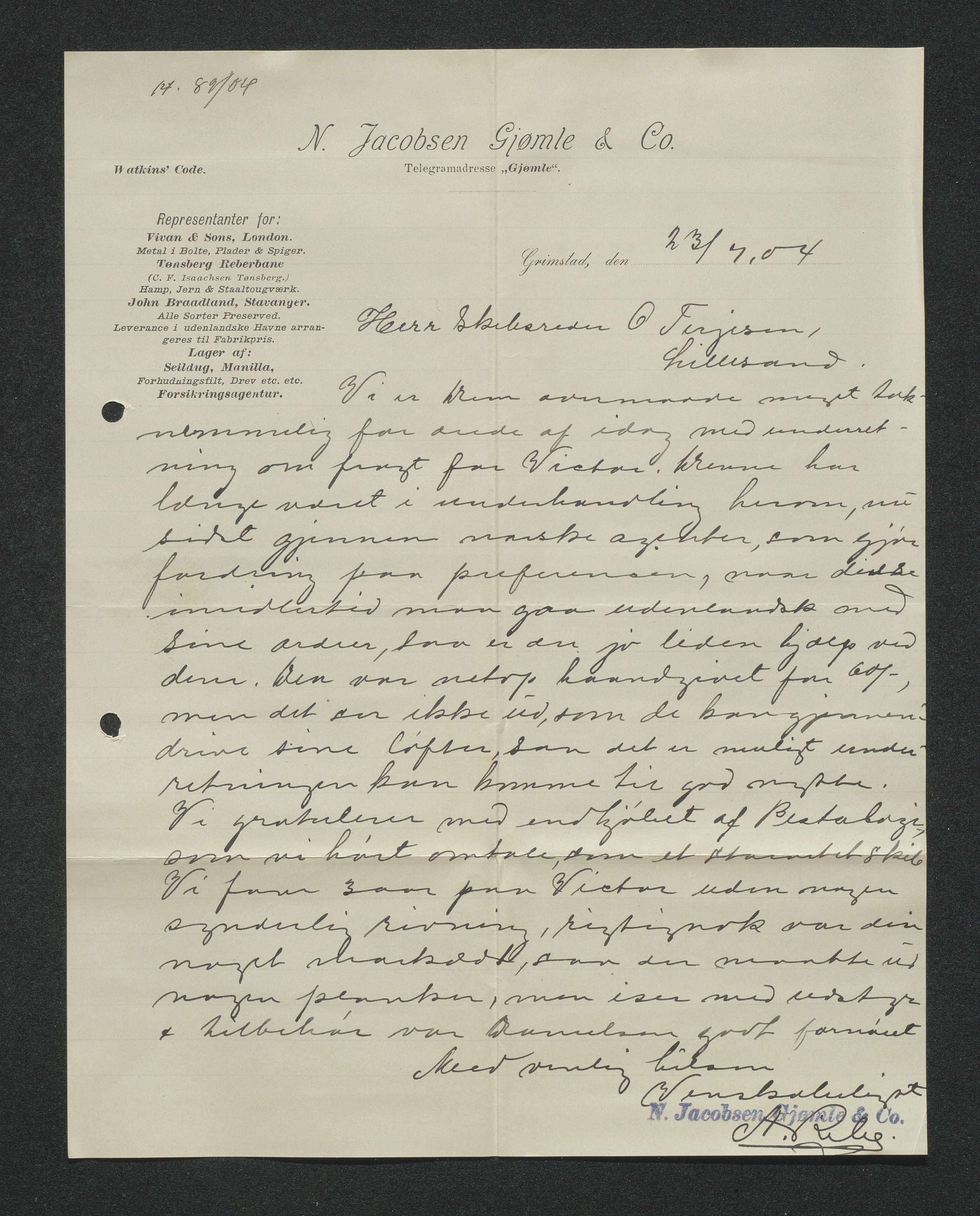O. Terjesens rederi, Korrespondanse 1904-1905, Astaref: AAKS/PA-2525/E/E01/L0013