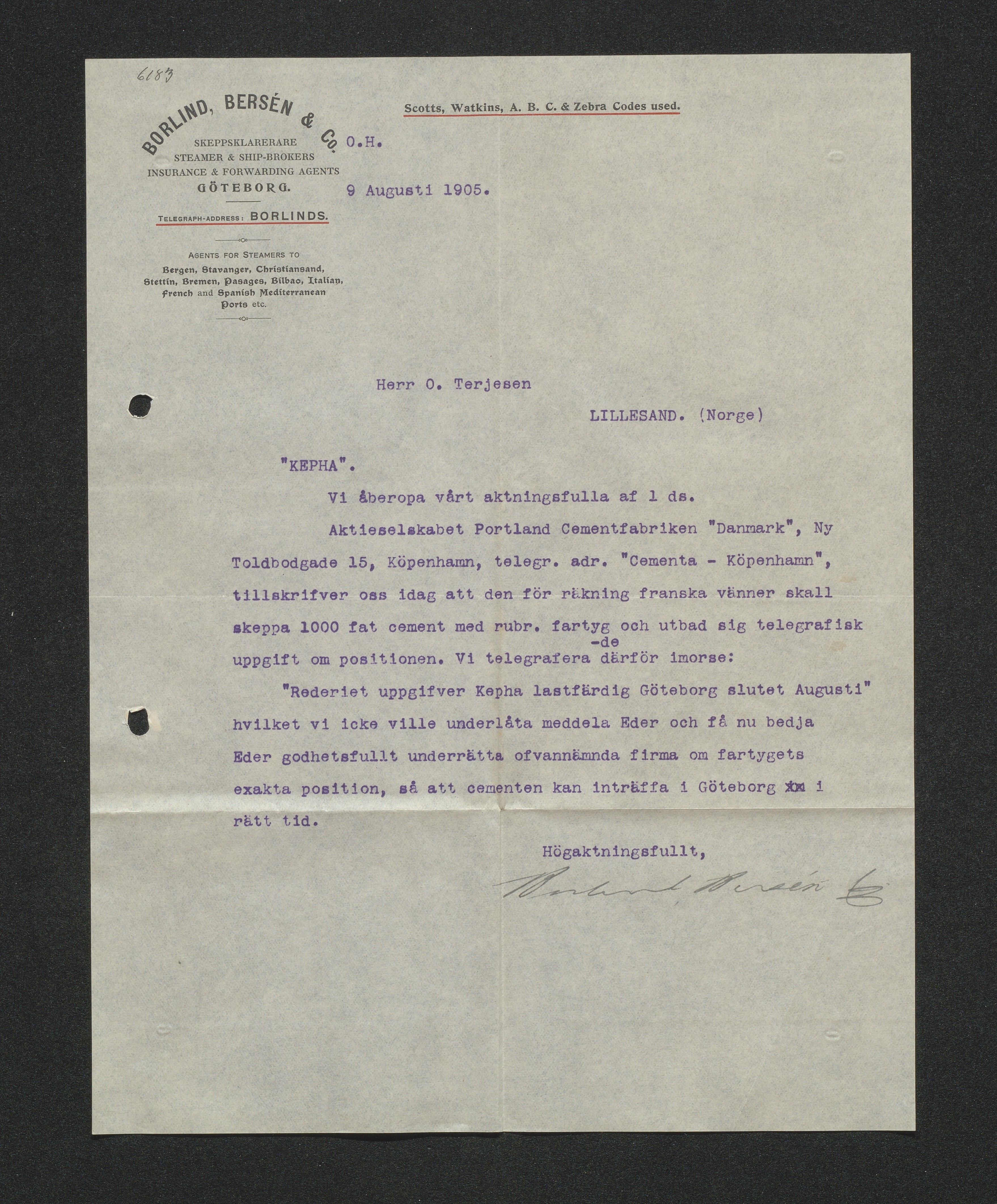 O. Terjesens rederi, Korrespondanse 1904-1905, Astaref: AAKS/PA-2525/E/E01/L0013