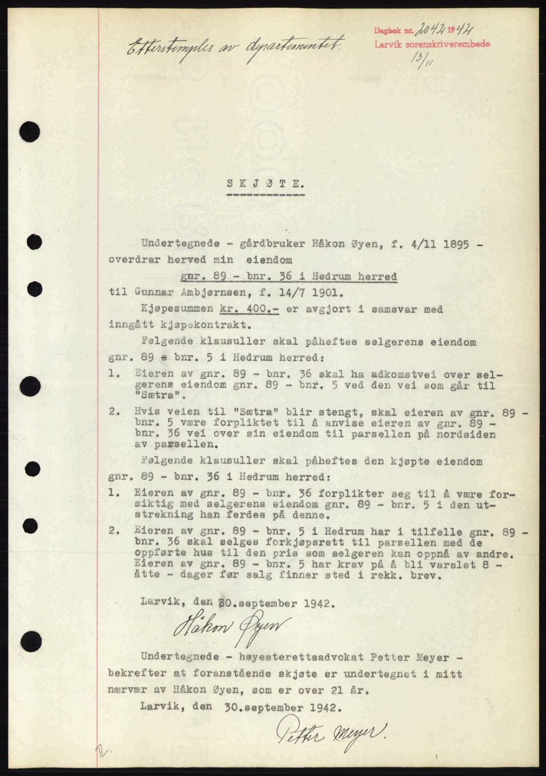 Mortgage book for Larvik sorenskriveri 1942-1943, Astaref: AV/SAKO-A-83/G/Ga/Gab/L0076