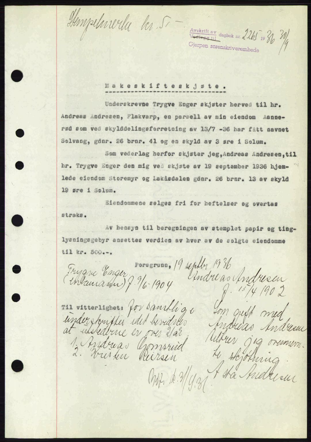 Mortgage book for Gjerpen sorenskriveri, Solum tinglag 1936, Astaref: AV/SAKO-A-216/G/Ga/Gac/L0067