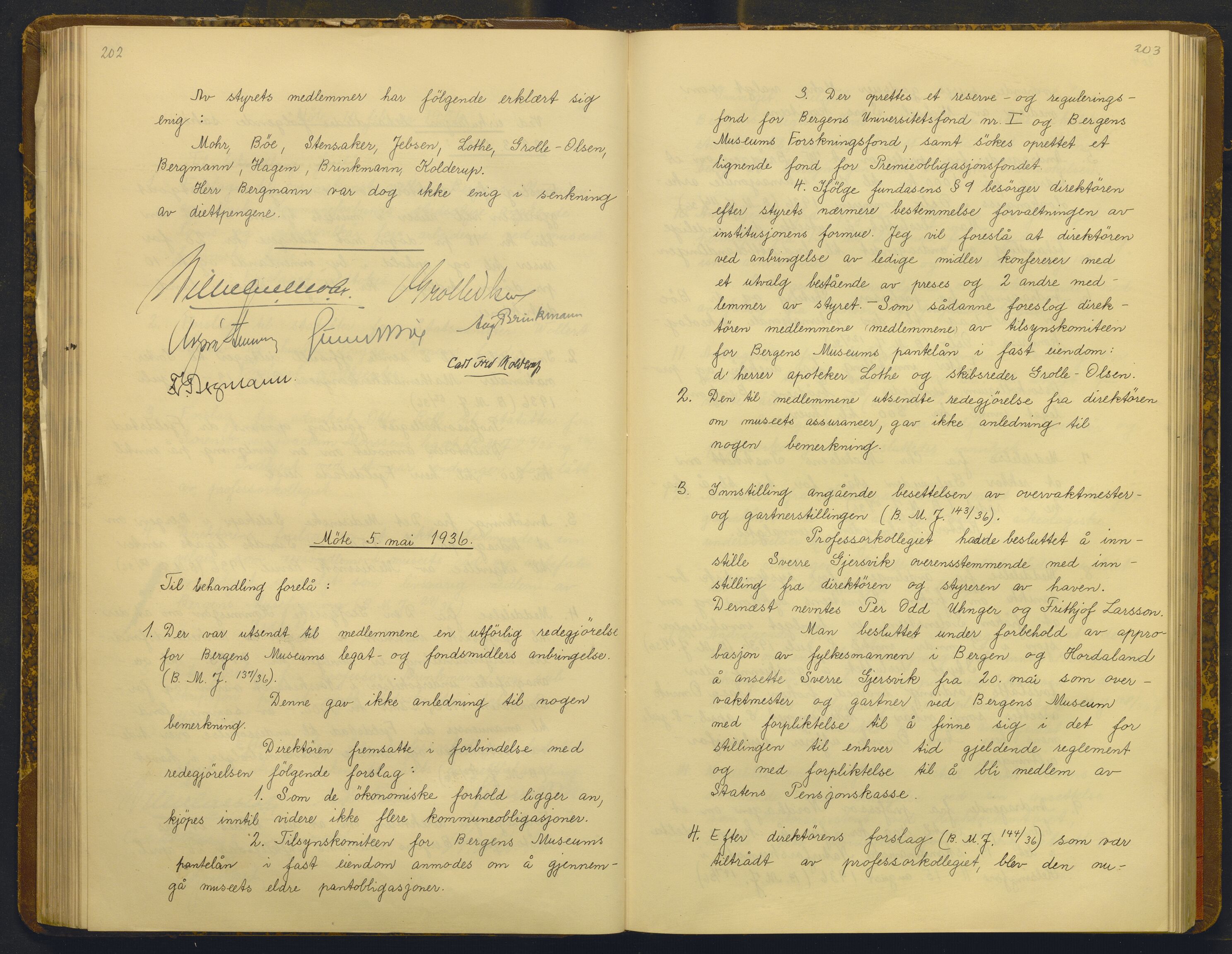 Bergens Museum (SAB), Styret (II), Møtebøker, referatprotokoller, forhandlingsprotokoller o.l., nr. 9: Forhandlingsprotokoll, 1927-1943, Astaref: AV/SAB-A-17301/02/A/L0009
