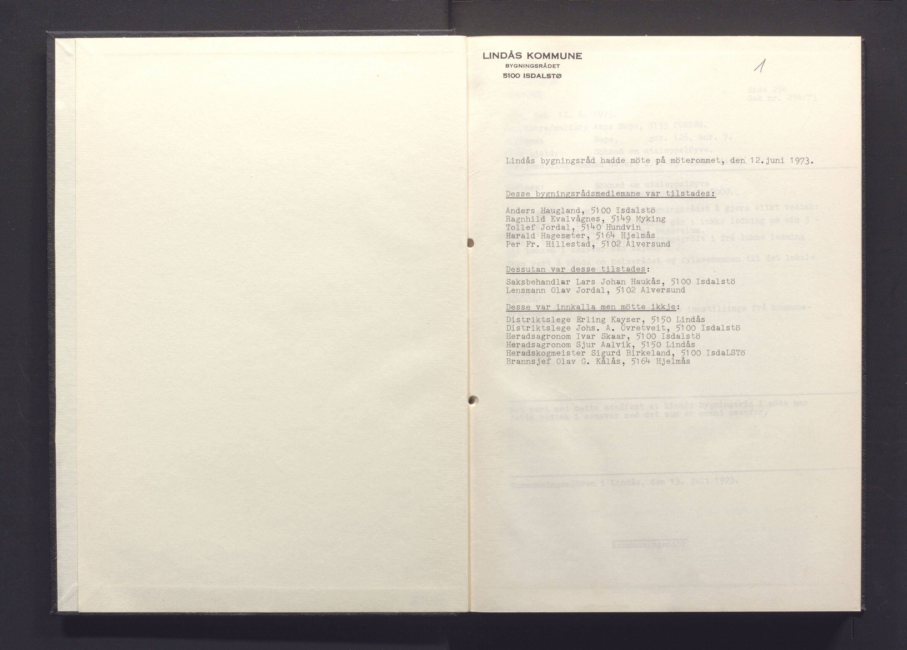 Lindås kommune, Bygningsrådet, Møtebok for Lindås bygningsråd, saksnr. 256/73 - 425/73, 1973, Astaref: IKAH/1263-511/A/Aa/L0012