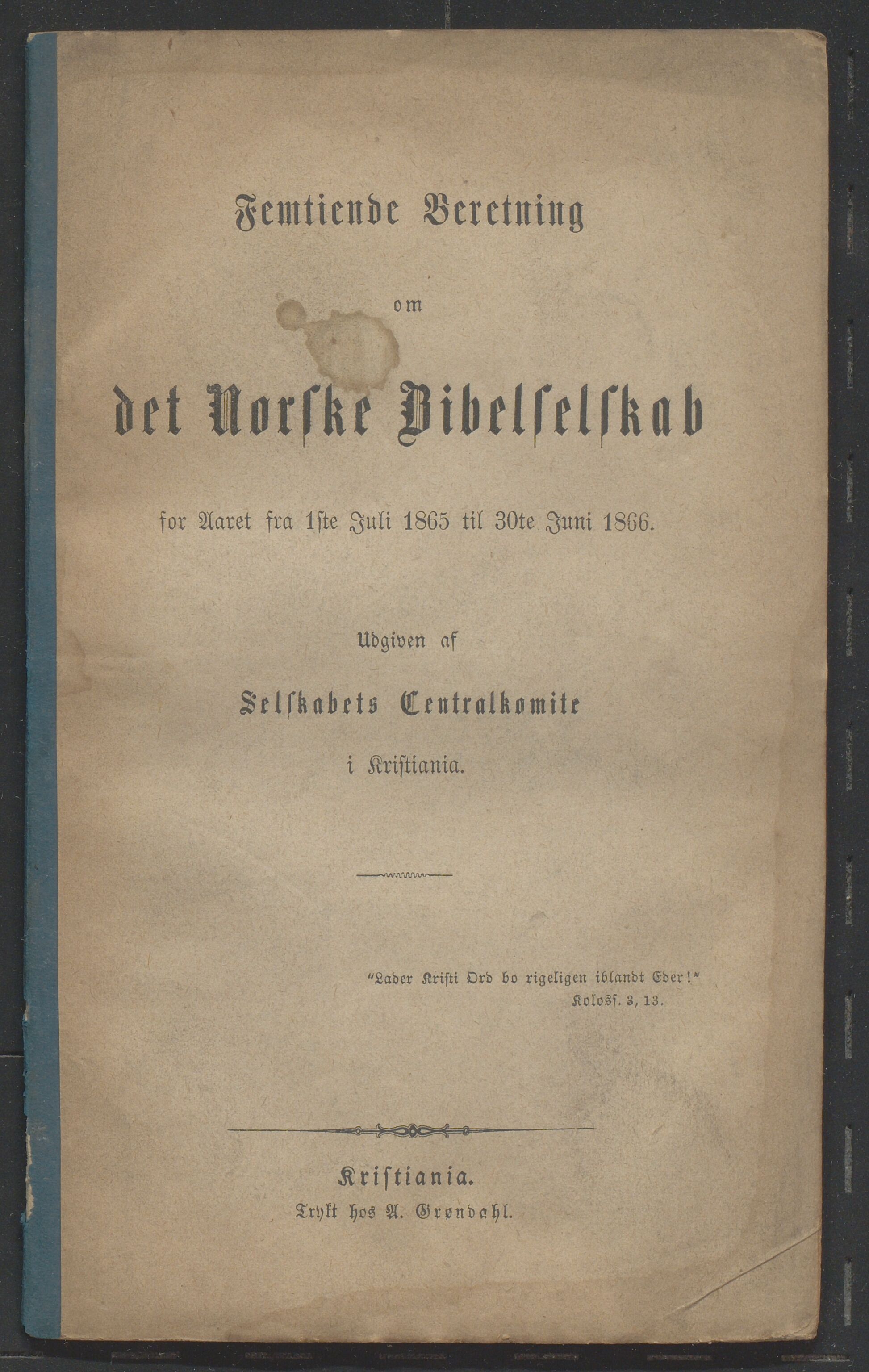 1865 - 1866-Det Norske Bibelselskap ble stiftet i 1816 og er således den eldste felleskirkelige organisasjonen i Norge. Bibelselskapet arbeider for å gi mennesker Guds ord «på et språk de forstår og til en pris de kan betale». Opprettelsen av et eget norsk universitet i 1811, frigjøringen fra Danmark og vedtak av Norges Grunnlov i 1814 og opprettelsen av eget norsk bibelselskap i 1816 er tre begivenheter som har hatt betydning for norsk historie fram til vår tid (Kilde: bibelselskapet.no)