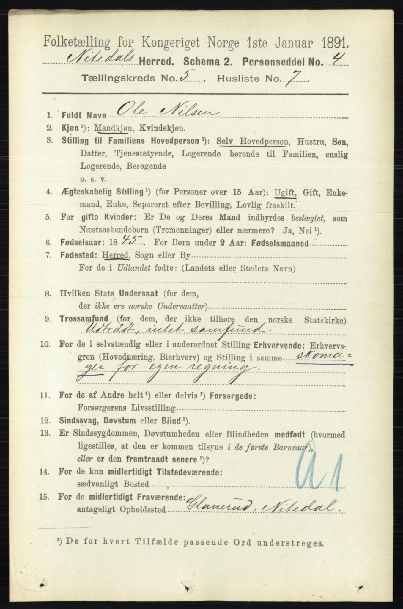 0002: Nitedal: Tellingskrets 1 State Census 01.01.1891 Akershus county