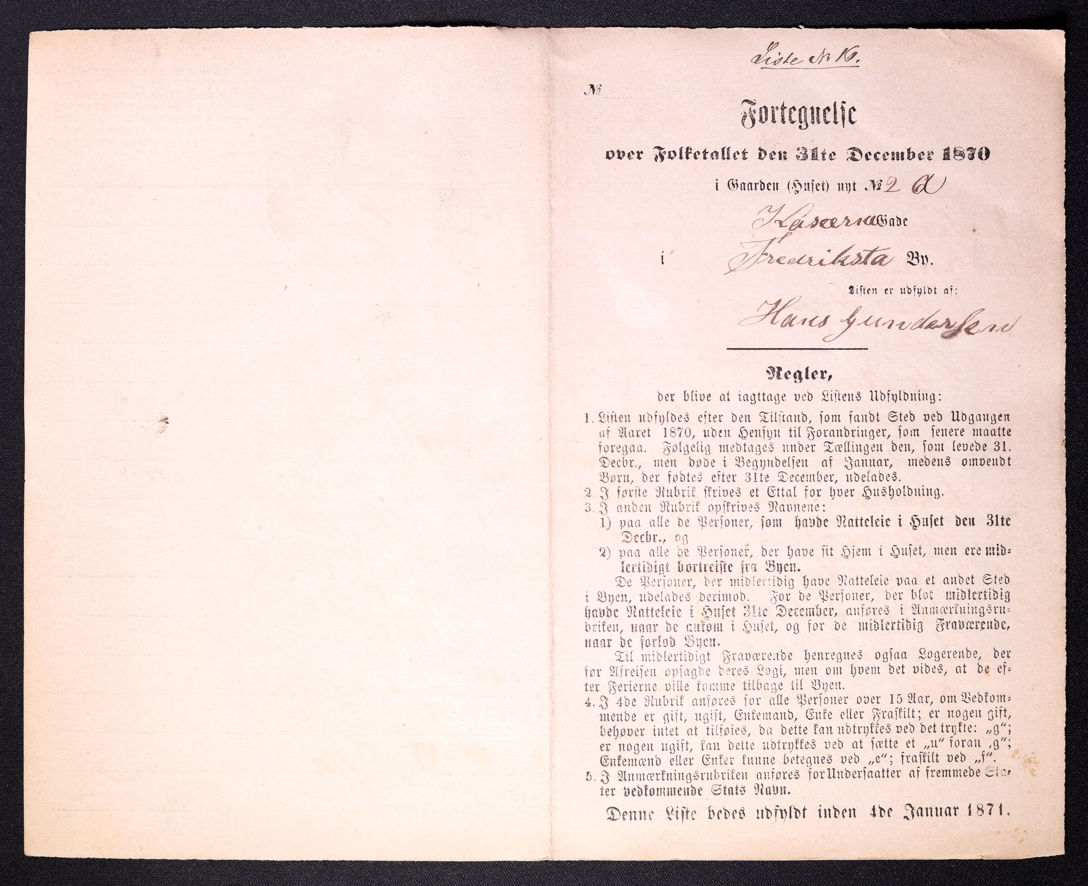 RA-S-2231: Statistisk sentralbyrå, Sosioøkonomiske emner, Folketellinger, boliger og boforhold E: FOLKETELLINGER El: Folketellingen 1870 L0003: Fredrikstad State Census
