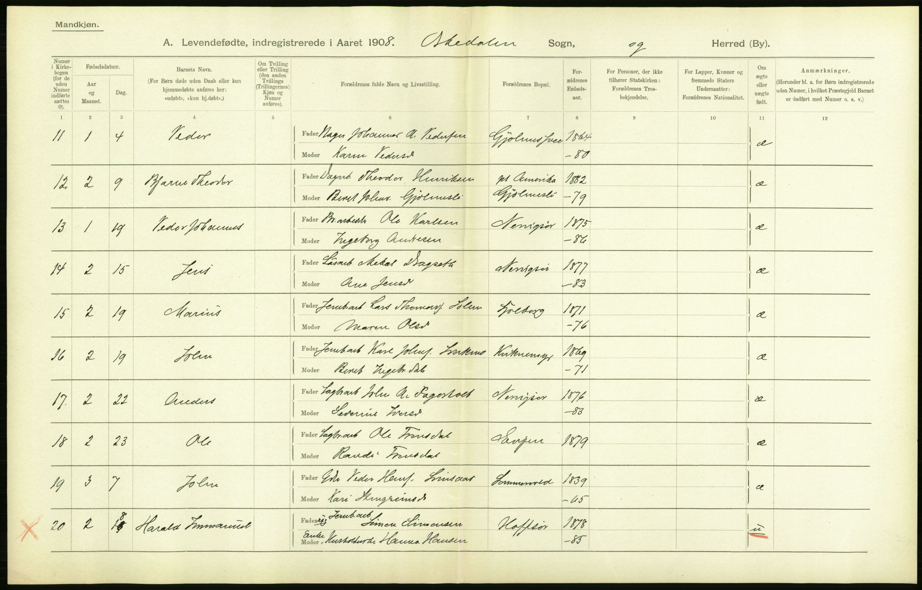 Statistisk Sentralbyrå, Folkemengdens bevegelse (Serie FB) 1908, no. 38: Søndre Trondhjems amt, Astaref: AV/RA-S-2228/D/Df/Dfa/Dfaf/L0038