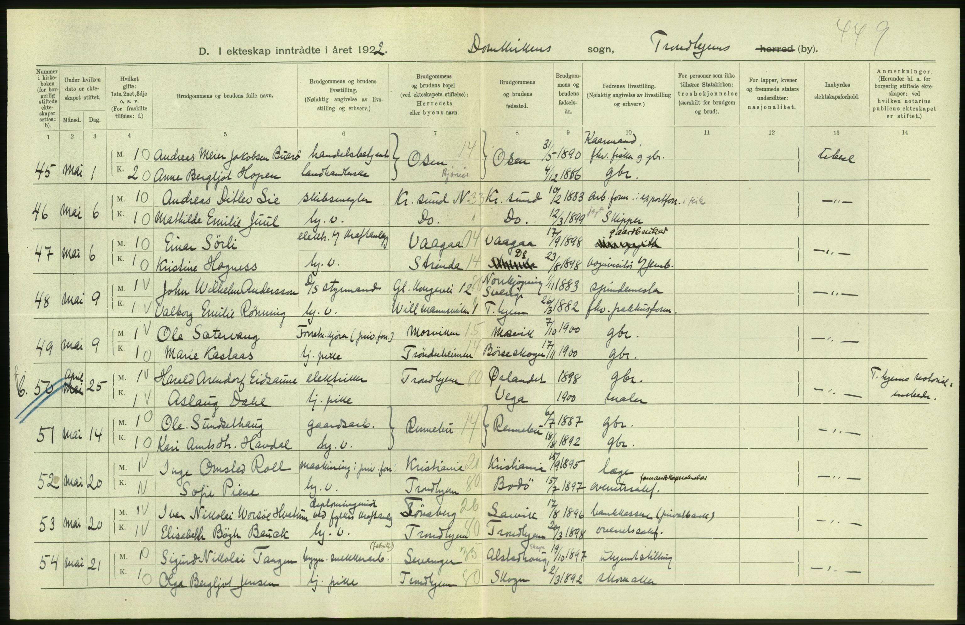Statistisk Sentralbyrå, Folkemengdens bevegelse (Serie FB) 1922, no. 40: Sør-Trøndelag, marriages, deaths and stillbirths in Trondheim, Astaref: AV/RA-S-2228/D/Df/Dfc/Dfcb/L0040