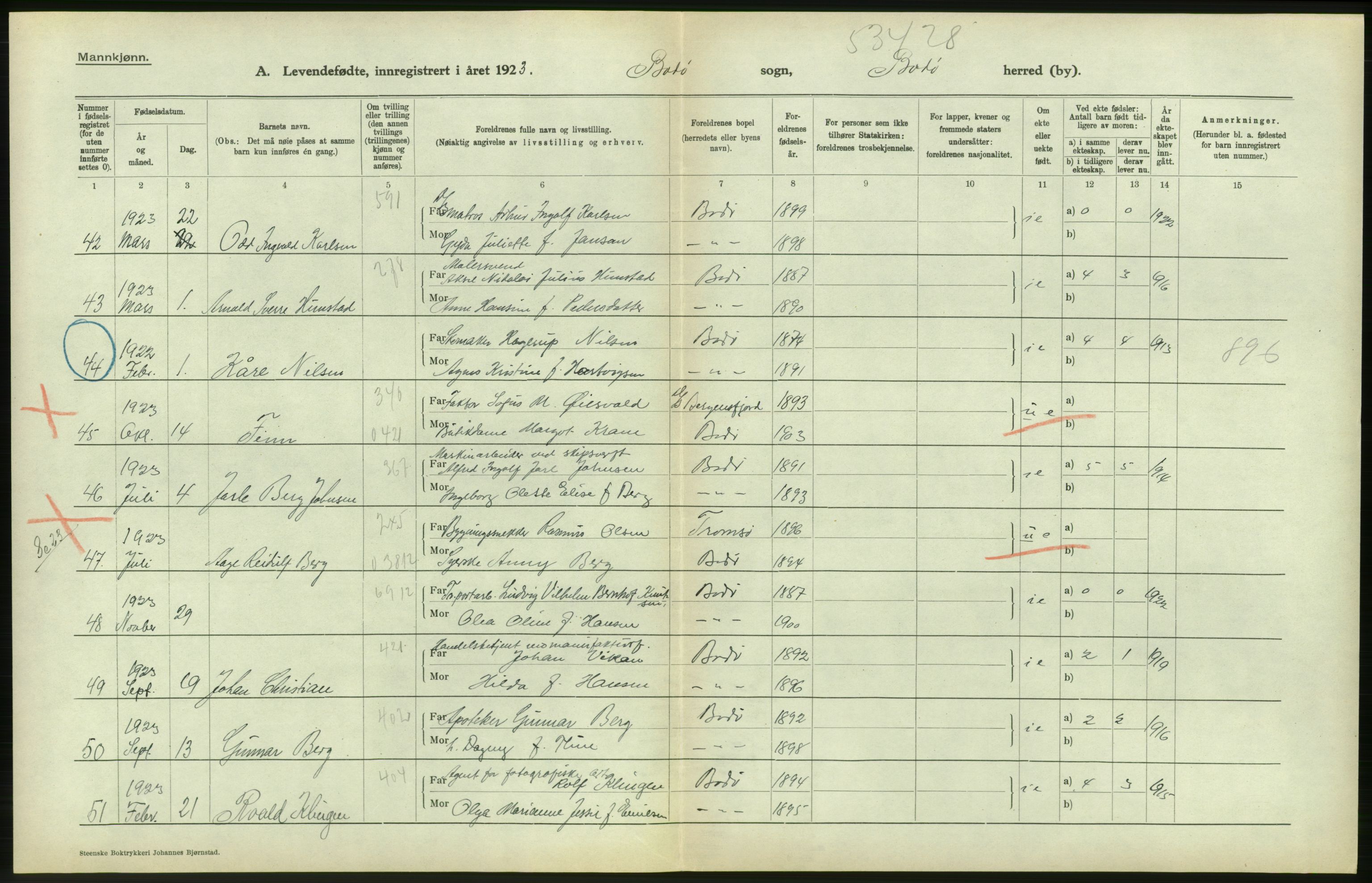 Statistisk Sentralbyrå, Folkemengdens bevegelse (Serie FB) 1923, no. 42: Nordland, births, cities, marriages, stillbirths, Astaref: AV/RA-S-2228/D/Df/Dfc/Dfcc/L0042