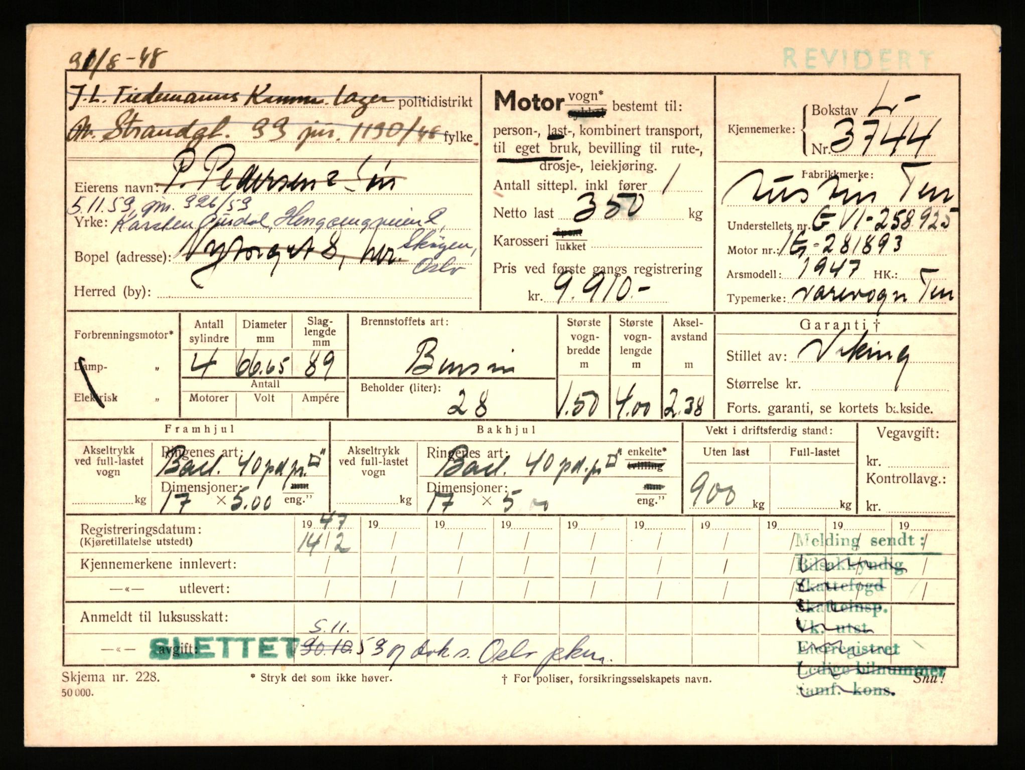 Stavanger trafikkstasjon, Dokumenter på kjøretøy, ca. 1930 - ca. 1971, nr. 11: L-3700 - L-4199, Astaref: AV/SAST-A-101942/0/F/L0011