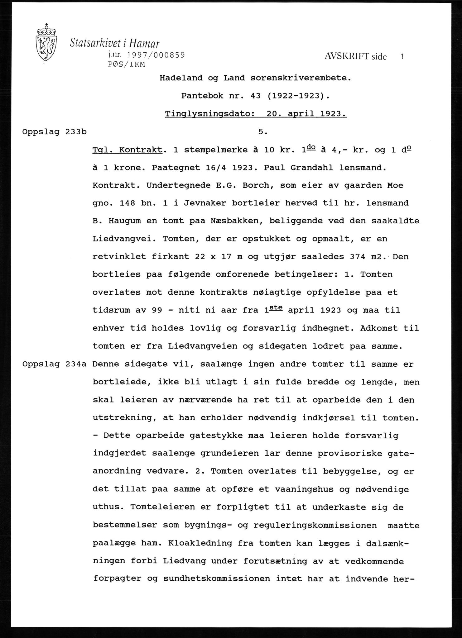 Avskriftssamlingen ved Statsarkivet i Hamar, Avskrifter fra Hadeland og Land sorenskriveri (Hadeland og Land tingrett), Pantebøker, nr. 43: 1922-1923, Astaref: AV/SAH-AVSKRIFT-001/H/Hh/Hha/L0043