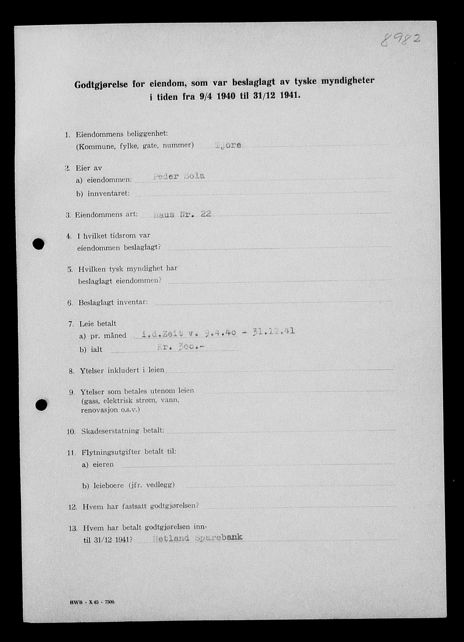 Justisdepartementet, Tilbakeføringskontoret for inndratte formuer, F. Godtgjørelse for beslaglagt eiendom 1940-1941, nr. 1015: Sola (O - Å) og øvrige Rogaland utenom Stavanger, Astaref: AV/RA-S-1564/I/L1015