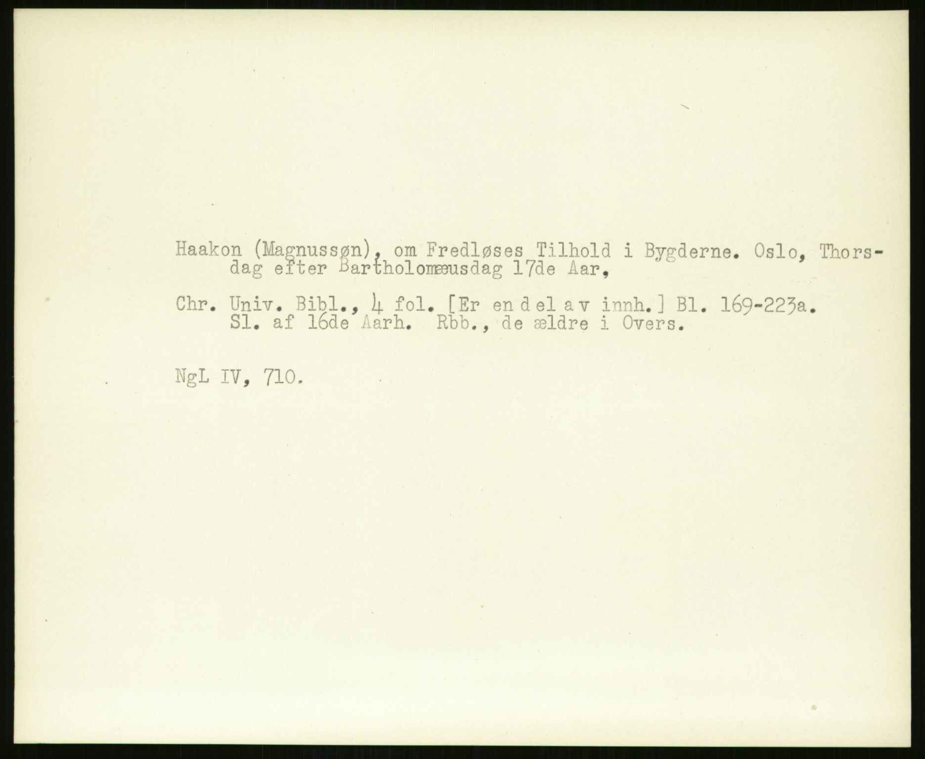 RA-S-6117: Norsk Historisk Kjeldeskrift-Institutt (NHKI) G: Rettshistorisk kommisjon Gc: Norges gamle lover (NGL) L0029: Tematisk register til Gustav Storms håndskriftbeskrivelser i NgL bd. IV Annen kilde