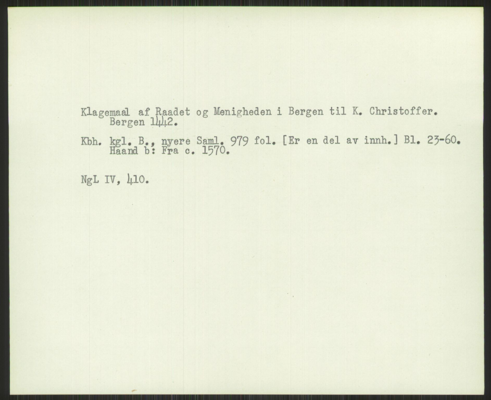 RA-S-6117: Norsk Historisk Kjeldeskrift-Institutt (NHKI) G: Rettshistorisk kommisjon Gc: Norges gamle lover (NGL) L0030: Tematisk register til Gustav Storms håndskriftbeskrivelser i NgL bd. IV Annen kilde