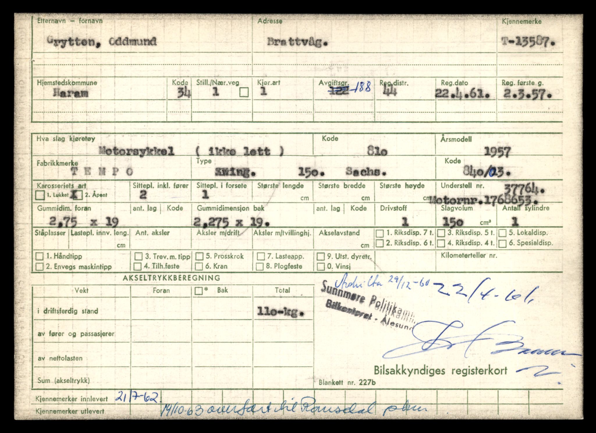SAT-A-4099: Møre og Romsdal vegkontor - Ålesund trafikkstasjon F: Bilregister Fe: Registreringskort for kjøretøy L0040: Registreringskort for kjøretøy T 13531 - T 13709 Annen kilde
