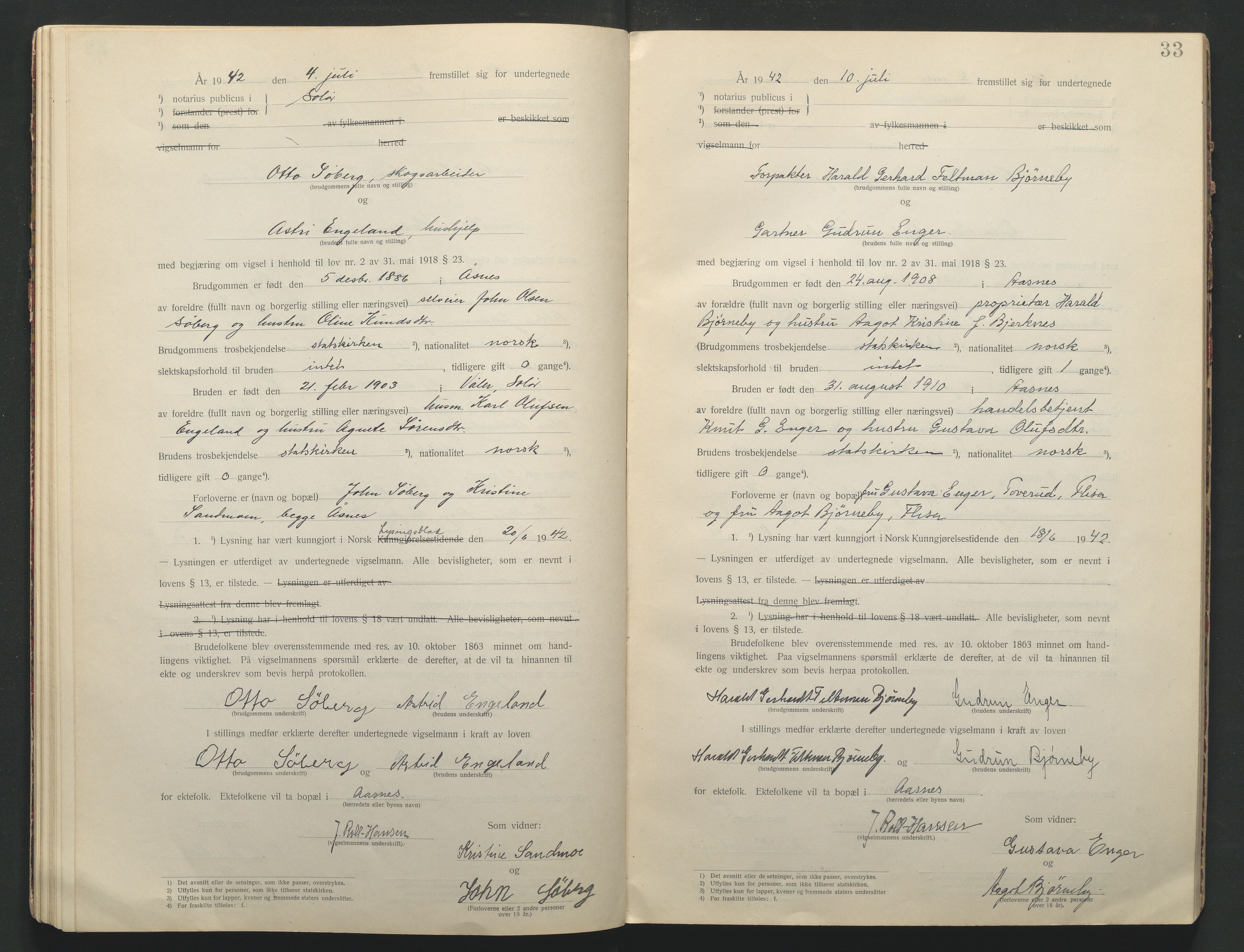 Vigselsbok (borgerlig) nr. 1 /1920 - 1943 - Solør sorenskriveri Notarialforretninger Borgerlige vielser Personopplysninger Forlovelse, lysning og ekteskap Statlige arkiver Dommere og skrivere