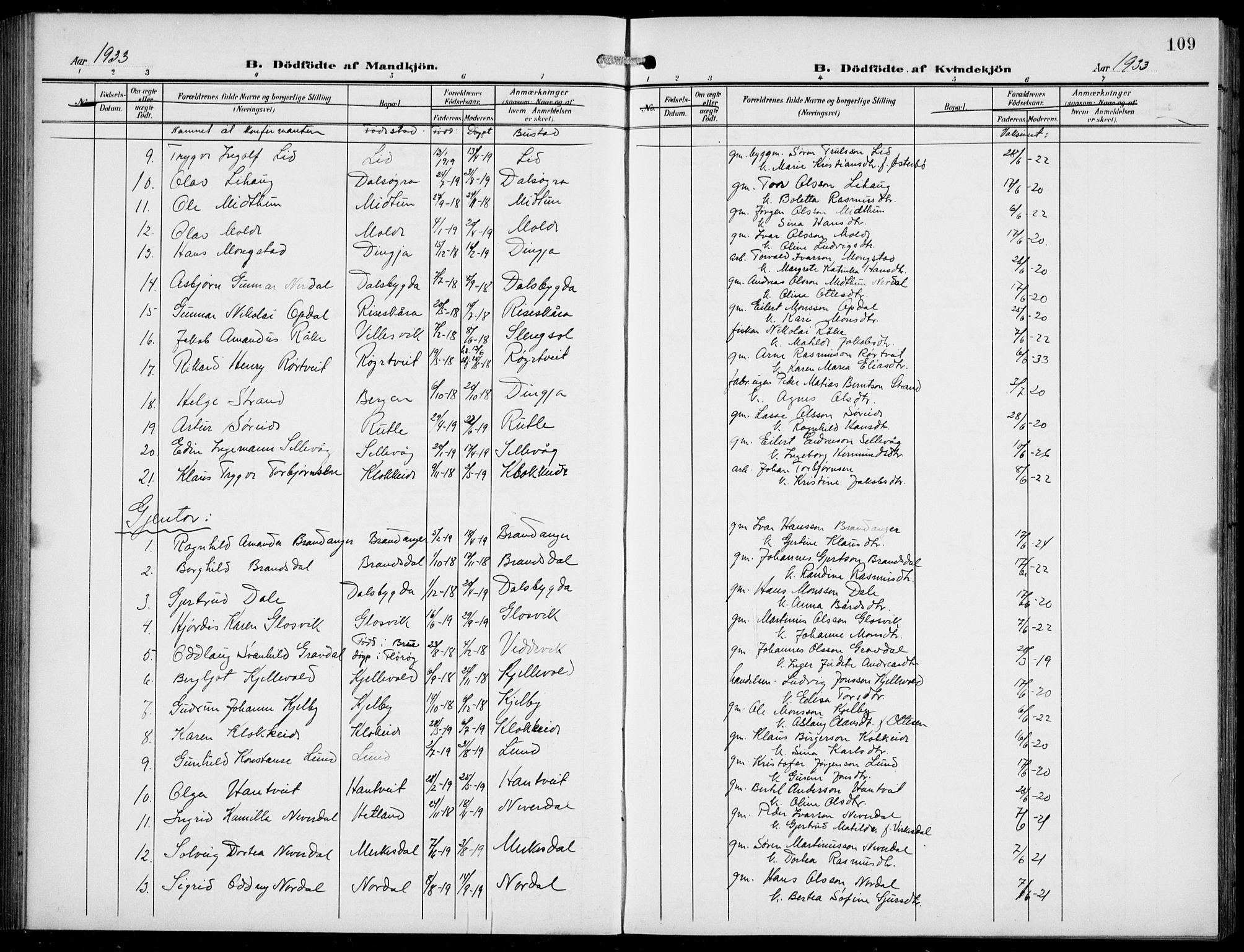 Gulen sokneprestembete, AV/SAB-A-80201/H/Hab/Habb/L0004: Klokkerbok nr. B 4, 1908-1936, s. 109