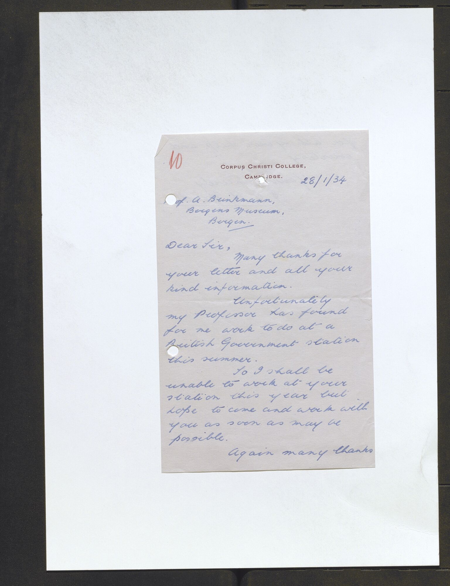 nr. 2 /1928 - 1940--SakarkivBrev og korrespondanseForskning og vitenskapStatlige arkiverUniversiteter og høyskolerMuseumBergens Museum 200 år