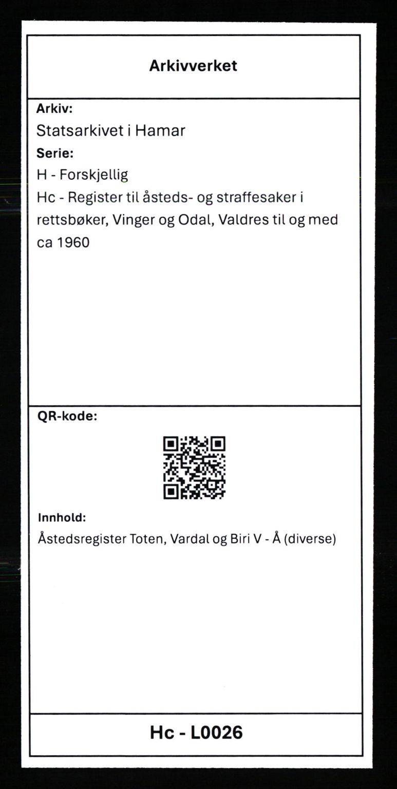 SAH-SAH-001: Statsarkivet i Hamar H: Forskjellig Hc: Register til åsteds- og straffesaker i rettsbøker L0026: Åstedsregister Toten, Vardal og Biri V - Å (diverse) Annen kilde