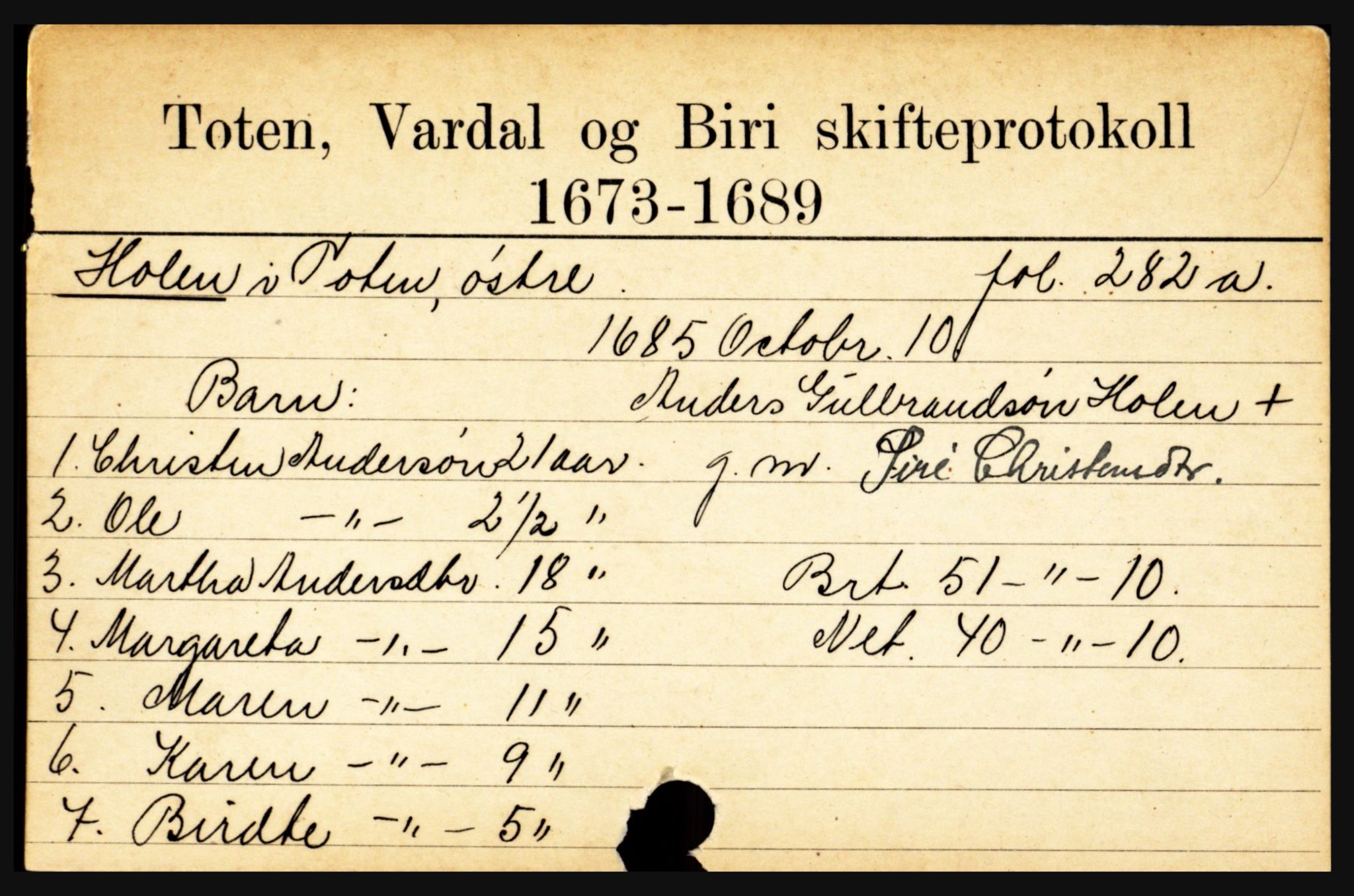 Toten, Biri og Vardal sorenskriveri, skiftekort 1657-1903, Astaref: AV/SAH-TING-006/J