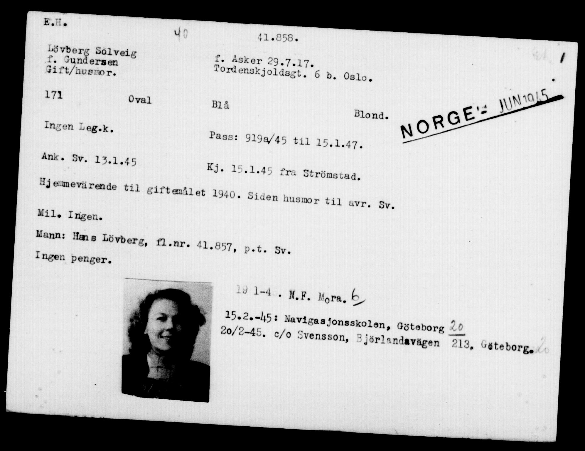 RA-S-6753: Utenriksstasjonene, Legasjonen i Stockholm, Flyktningkontoret V: Mikrofilm Va: Kjesäterkartoteket L0016: Kjesäterkartoteket, flyktninger med registreringsnr. 40700-43479 Flyktninger til Sverige 1940-1945