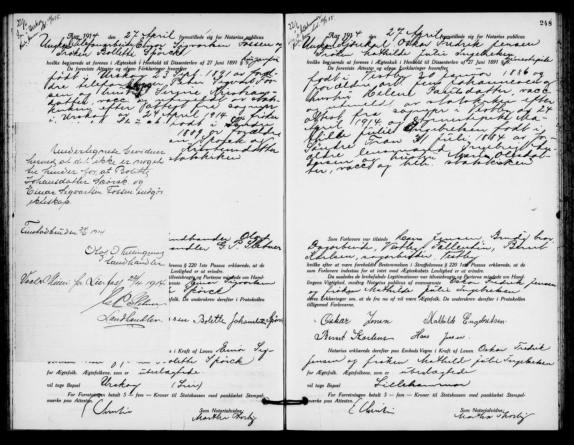 Oslo byfogd avd. I, Notarialprotokoller, Rekke II - Borgerlige vigsler, nr. 9: 3.5.1913 - 27.11.1914, Astaref: AV/SAO-A-10220/L/Lb/Lbb/L0009