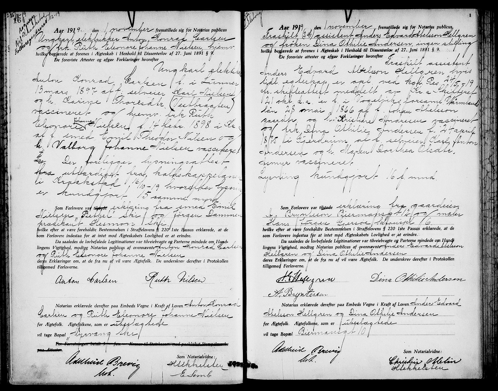 nr. 13 /06.06.1919 - 17.03.1920Oslo fylke Oslo byfogd Notarialprotokoll, Rekke II: VigslerNotarialforretningerBorgerlige vielserPersonopplysningerForlovelse, lysning og ekteskapStatlige arkiverDommere og skrivere