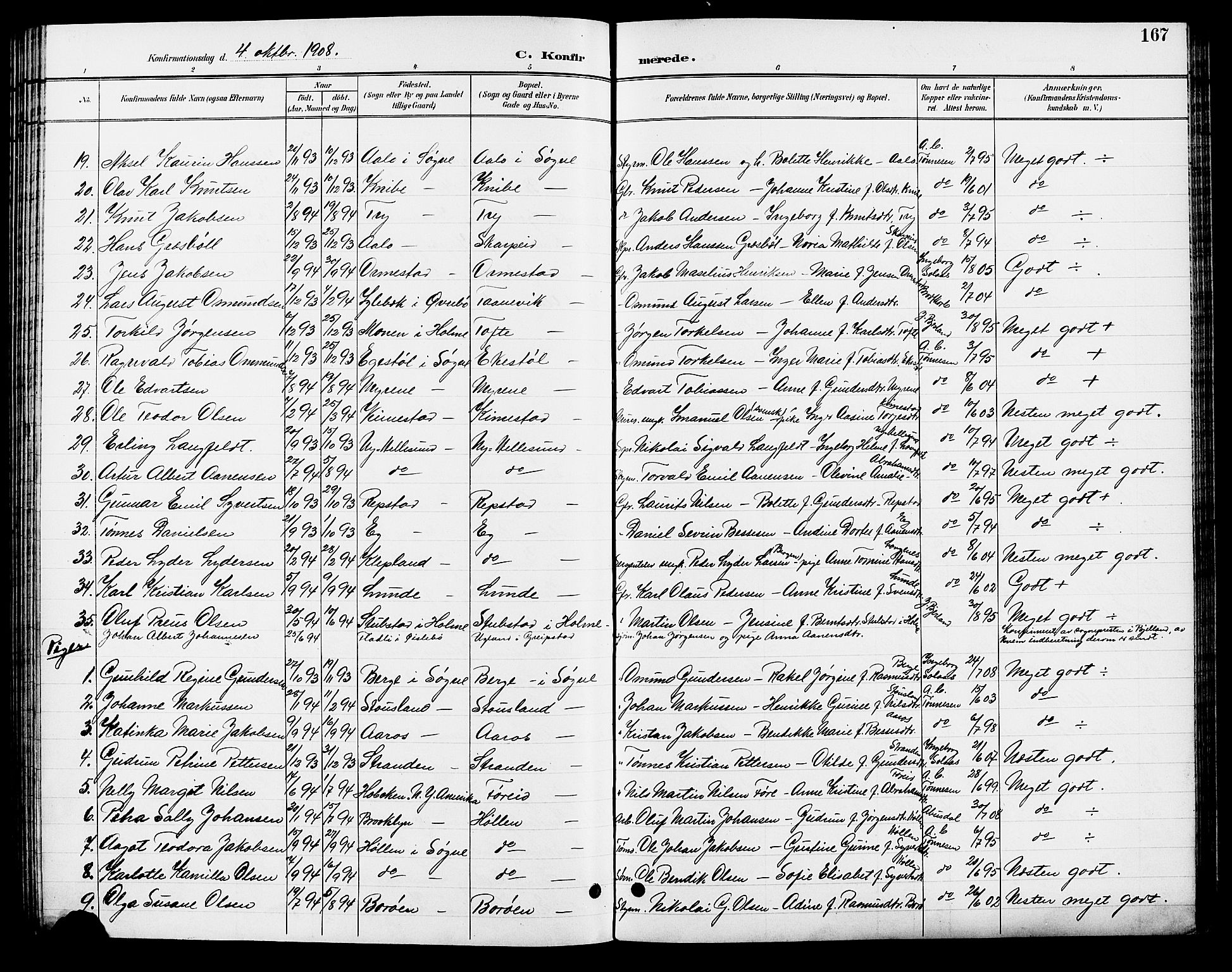 Søgne sokneprestkontor, AV/SAK-1111-0037/F/Fb/Fbb/L0006: Klokkerbok nr. B 6, 1892-1911, s. 167