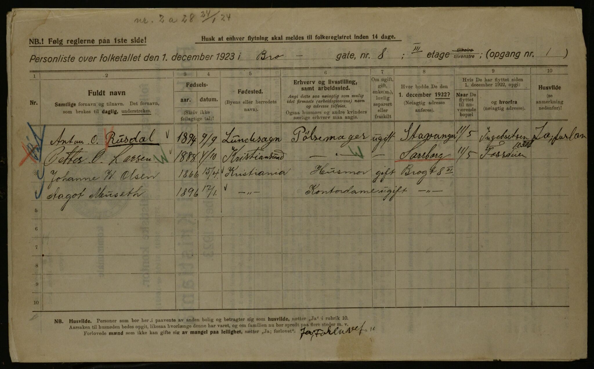 Kommunal folketelling 1.12.1923 for Kristiania, Astaref: OBA/A-20057/Gbv