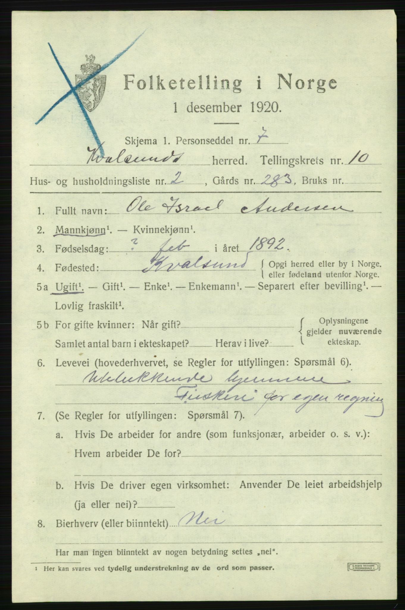 Folketelling 1920 for 2017 Kvalsund herred