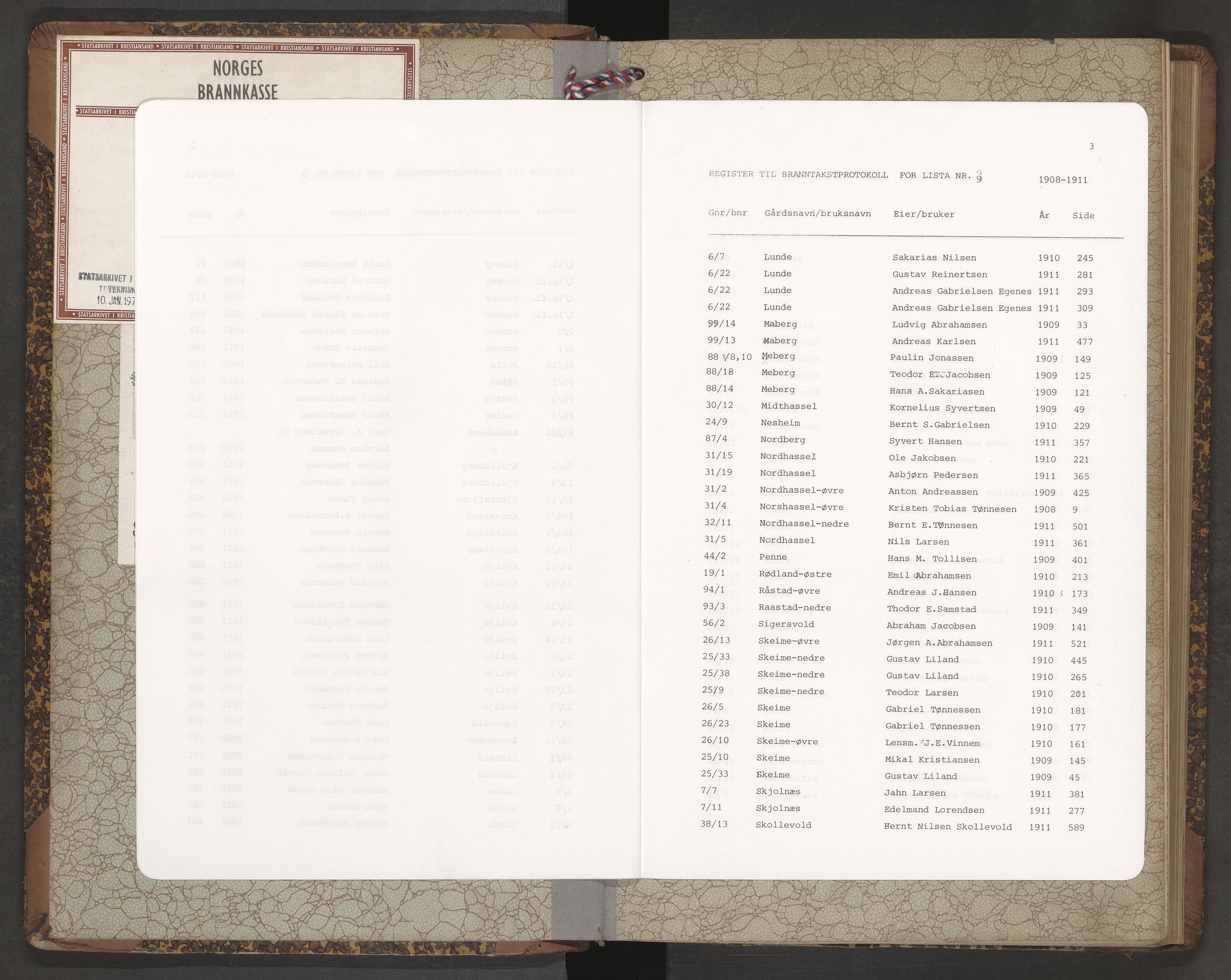 nr. 9 /1908 - 1911-Branntakstprotokoll nr. 9 med gårdsnavnregisterBranntaksterEiendomForsikring og assuranseStatlige arkiverHus og bygninger